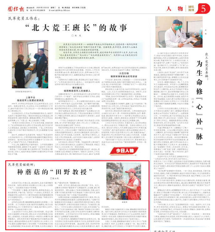 近日,我校生命科学与工程学院民革党员姬晓娜的先进事迹以《种蘑菇的“田野教授”》为题在《团结报》刊发,充分展现了她在教学科研、人才培养与服务乡村振兴等方面的突出成绩。《团结报》由民革中央主办,是我国八个民主党派唯一的中央级党报,是展示民主党派及党外知识分子良好形象、宣传爱国统一战线与多党合作制度的重要阵地。此次报道不仅是对姬晓娜个人工作的高度认可,更是对我校党委党外知识分子统战工作成效的有力肯定。