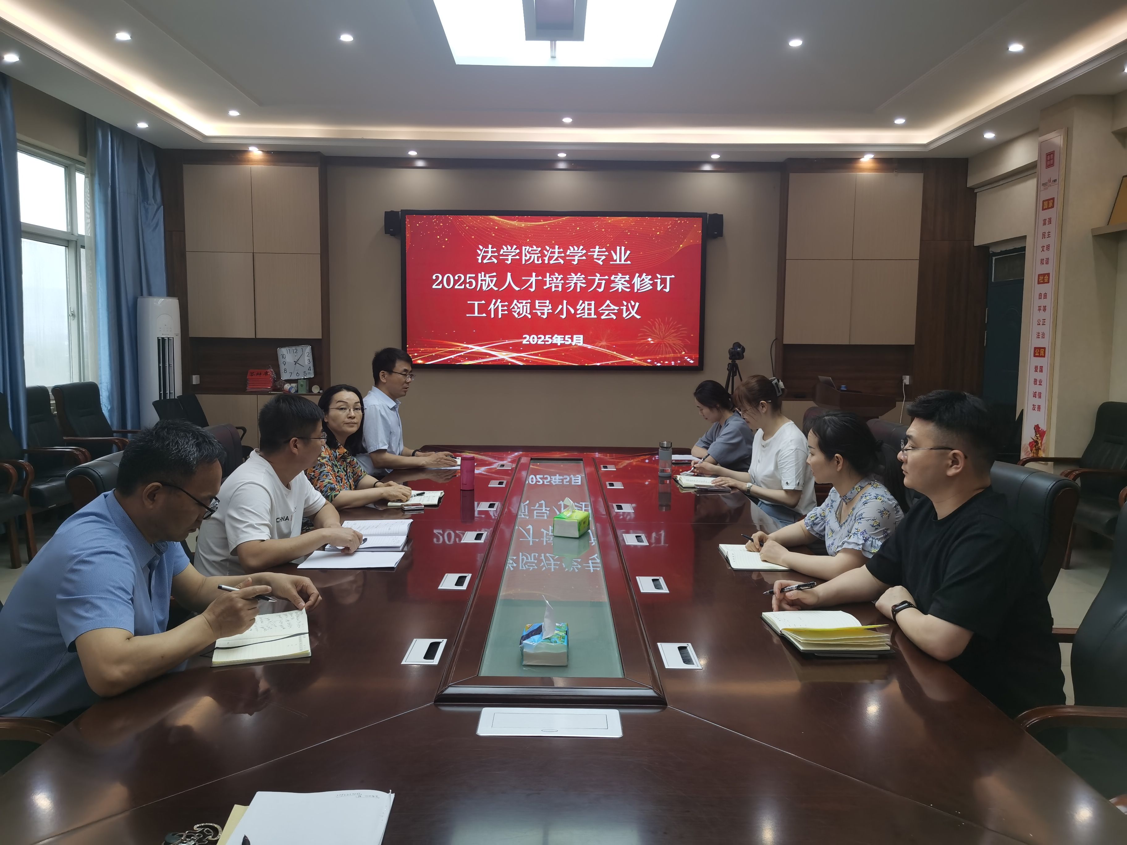 2025年5月13日下午,法学院在院会议室召开法学专业2025版人才培养方案制定领导工作小组研讨会。会议由法学院副院长马东丽主持,工作小组成员参加会议。
